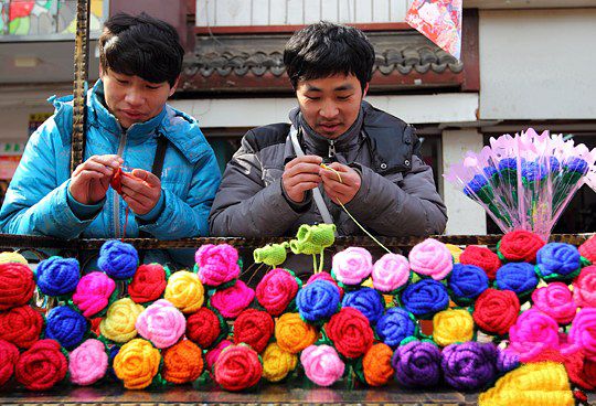 2月10日,南京夫子廟老街上的兩位男青年用絨線和鉤針編織手工玫瑰花引來圍觀。中新社發(fā) 泱波 攝據(jù)了解,這兄弟倆來自河南商丘,哥哥叫張冰、弟弟叫張贊,他倆在……