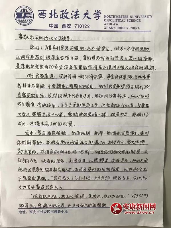2016年11月24日一個(gè)平凡的日子里,一封從西北政法大學(xué)經(jīng)濟(jì)學(xué)院寄來的感謝信,“面對(duì)你們的幫助,我唯有銘記父母師長的囑托,刻苦學(xué)習(xí),努力拼搏,勤儉節(jié)約,珍惜資助到手的每一分錢,不辜負(fù)你們和父母的期望,以自信的態(tài)度,執(zhí)著的信念,刻苦學(xué)習(xí),以德博學(xué),完成學(xué)業(yè),把自己磨練成品學(xué)兼優(yōu)的合格有用人才,為將來更好的回報(bào)祖國,回報(bào)社會(huì)打下堅(jiān)實(shí)的基礎(chǔ)。”她叫王梅,出生于一個(gè)貧困家庭的大學(xué)生,家住陜西省平利縣洛河鎮(zhèn)線河村一組,父親身患?xì)埣玻赣H體弱多病,家庭生活僅靠父母務(wù)農(nóng)、打短工維系,家庭月收入不足千元,尚有患精神病的外婆需要贍養(yǎng)。
