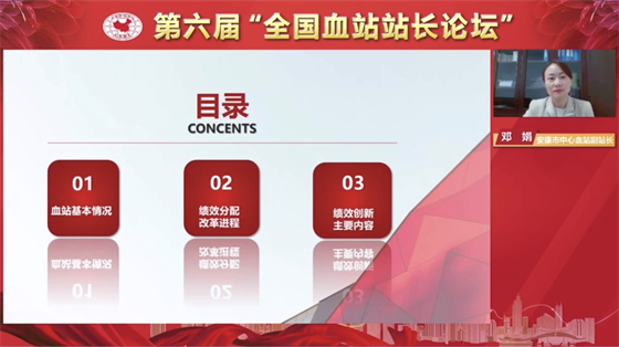 為加強(qiáng)全國(guó)血站的經(jīng)驗(yàn)交流與合作,2021年10月27日至28日,第六屆 “全國(guó)血站站長(zhǎng)論壇”在深圳市舉辦。中國(guó)輸血協(xié)會(huì)理事長(zhǎng)、世界衛(wèi)生組織輸血合作中心主任朱永明,深圳市衛(wèi)健委二級(jí)巡視員林漢城等相關(guān)領(lǐng)導(dǎo)出席并致辭。此次論壇的主題是“血站建設(shè)與發(fā)展、改革與創(chuàng)新”,來自全國(guó)各省、市血液中心(血站)的同仁通過線上方式參加會(huì)議。安康市中心血站副站長(zhǎng)鄧娟作為全國(guó)血站六個(gè)優(yōu)秀論文交流發(fā)言人之一,就安康血站績(jī)效分配、改革與創(chuàng)新工作在會(huì)上進(jìn)行了經(jīng)驗(yàn)交流。