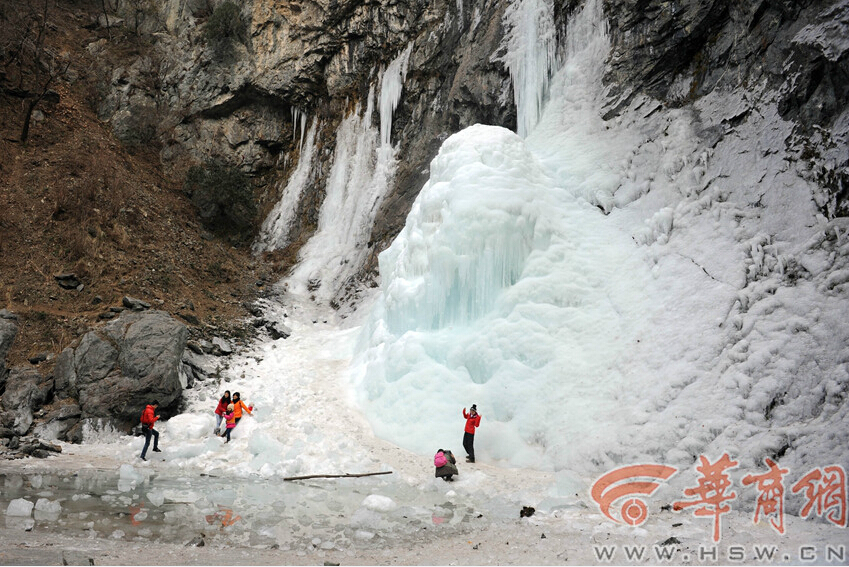 在附近西成高鐵施工的孫師傅說,2014年12月中旬,瀑布才開始結(jié)冰,每天都會吸引數(shù)百名游客來此參觀。瀑布結(jié)冰后,早晨比較結(jié)實(shí),但上午太陽出來后,冰瀑頂部的冰層開始融化,下午一兩點(diǎn),是冰柱或冰碴掉落的高峰期。“前兩天還有冰碴掉下來把人砸了,但情況不嚴(yán)重。”孫師傅說。
