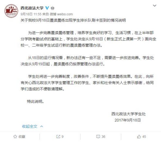 學(xué)生處將進(jìn)一步完善制度,改善條件,不斷提升晨讀晨練效果。在此,向所有關(guān)心西北政法大學(xué)學(xué)生管理工作的學(xué)生、家長和社會有關(guān)人士表示感謝,給同學(xué)們造成的不便敬請理解。