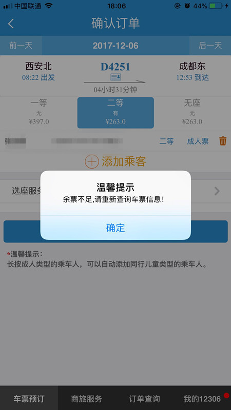 此外,12月6日承擔西成高鐵成都東開往西安北方向首發(fā)任務(wù)的D4252次旅客列車車票同樣也全部售罄。截至記者發(fā)稿時,往返西安北至漢中、重慶方向的動車組列車余票充足,旅客可順利購買。