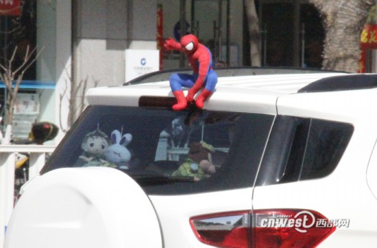 蜘蛛俠玩偶“坐”上汽車車頂很是顯眼