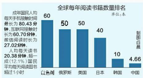 有網(wǎng)絡(luò)資料顯示,全世界每年閱讀書籍?dāng)?shù)量排名第一的是以色列,平均每人一年讀書量超過60本,俄羅斯和美國均在50本左右,而就算是我們的鄰居日本也達到40本左右,韓國較少卻也在10余本的水平。