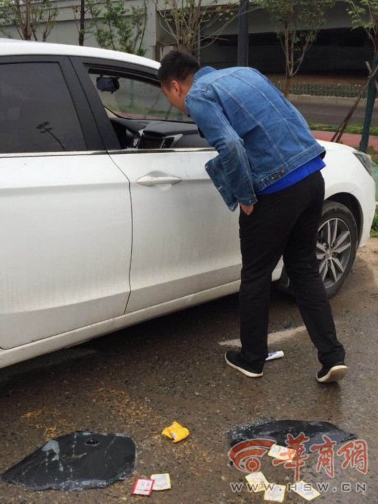 在三橋西部國(guó)際車(chē)城對(duì)面的空地上,華商報(bào)記者見(jiàn)到了6、7輛車(chē)玻璃被砸的轎車(chē),地面上密集地散落著整片的車(chē)玻璃,還有從車(chē)內(nèi)翻出來(lái)的車(chē)墊、牙膏等日用品。一輛后車(chē)玻璃被砸了大洞、側(cè)面玻璃被砸多個(gè)小洞的的黃色小轎車(chē)車(chē)主氣憤地說(shuō):“真是缺德!