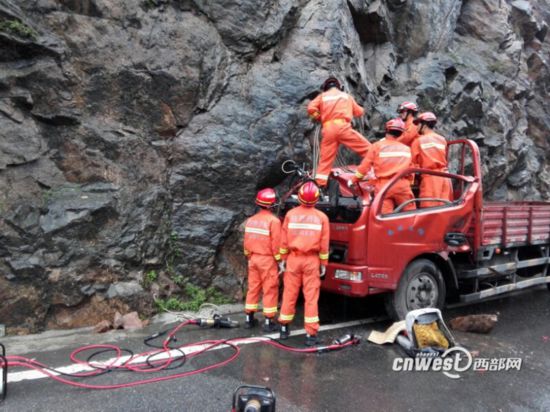 310國道落石砸中過往車輛一人被困,消防緊急救援。