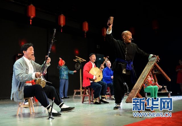 在陜西西安藍田縣白鹿原影視城,藝人們在表演華陰老腔(6月9日攝)新華社記者 劉瀟 攝