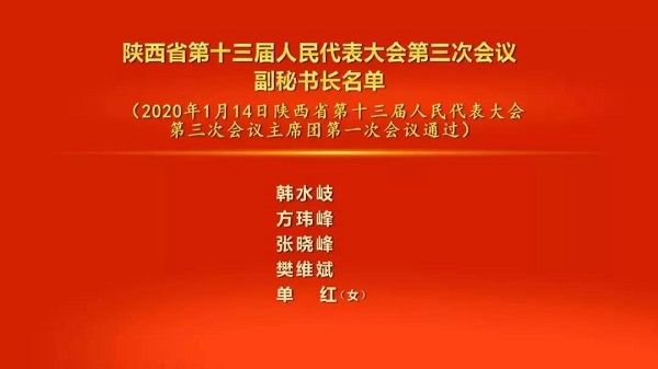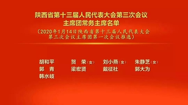 會(huì)議以按表決器方式,推選出由胡和平、賀榮、劉小燕、朱靜芝、郭青、梁宏賢、戴征社、郭大為、韓水岐組成的主席團(tuán)常務(wù)主席;決定了會(huì)議日程;決定了大會(huì)執(zhí)行主席分組名單;決定韓水岐、方瑋峰、張曉峰、樊維斌、單紅擔(dān)任大會(huì)副秘書(shū)長(zhǎng)。