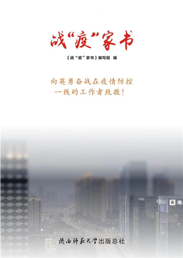 陜西師大出版總社積極響應(yīng)、主動(dòng)作為,全國(guó)首推《戰(zhàn)“疫”家書》一書,用文字和圖片生動(dòng)記錄了一封封戰(zhàn)“疫”家書,講述抗疫一線的感人事跡,訴說(shuō)著“白衣戰(zhàn)士”等平凡英雄內(nèi)心深處的真情與大愛。微信短信,手機(jī)里有字里行間的情感流露,見字如面,紙短情長(zhǎng)。家書中,有難舍的牽掛,有家人的囑托,有醫(yī)務(wù)工作者“健康所系,性命相托”的莊嚴(yán)承諾,更有用無(wú)比的勇氣和斗志奔赴抗疫戰(zhàn)場(chǎng)的家國(guó)情懷。