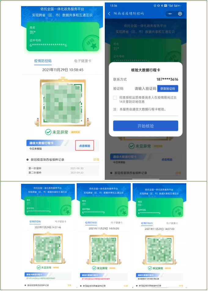 居民可在微信或支付寶中打開陜西健康碼小程序的“我的防控碼”界面,就能看到在防控碼下方專有一欄“通信大數(shù)據(jù)行程卡”,“點擊核驗”即可根據(jù)陜西疫情防控碼所綁定手機號查詢最近14天是否到過中高風險地區(qū)。并且疫情防控碼頁面上僅保留當日的核驗結(jié)果,如第二天使用需要再次點擊核驗。vJY安康新聞網(wǎng)