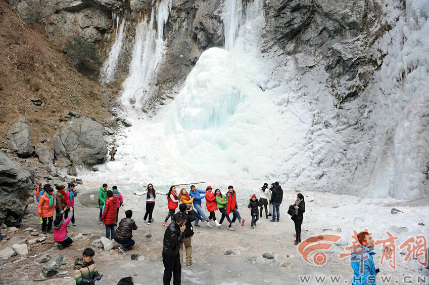 昨日下午2時,游客在戶縣澇峪黑山瀑布前合影留念。不時有冰塊從瀑布上方掉落,著實讓人捏了一把汗 記者 趙彬 攝進入冬季后,秦嶺72峪開始出現(xiàn)冰凍瀑布的奇觀,不……