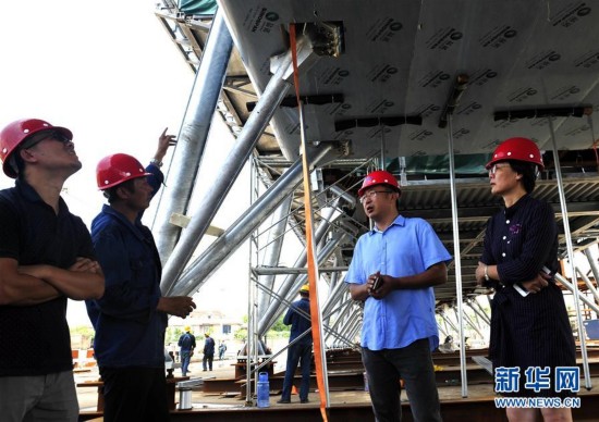 中國電子進出口總公司費拉茲站建設(shè)項目組經(jīng)理曹虹(右一)和副經(jīng)理焦陽(右二)在位于上海的預(yù)拼裝現(xiàn)場檢查施工進度(8月25日攝)。ePR安康新聞網(wǎng)