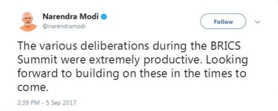 廈門會晤期間,印度總理莫迪關(guān)于“金磚”發(fā)了至少15條推文。會晤一結(jié)束,莫迪連發(fā)6條推文,介紹參會成果,其中3條是這么說的: