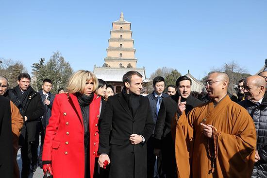 “參觀完兵馬俑后,馬克龍總統(tǒng)一行趕往大雁塔!标惓空f(shuō)。中國(guó)佛教協(xié)會(huì)副會(huì)長(zhǎng)、陜西省佛教協(xié)會(huì)會(huì)長(zhǎng)、大慈恩寺方丈增勤法師陪同馬克龍總統(tǒng)一行參觀了大雄寶殿,并登上大雁塔;監(jiān)院道宏法師為其介紹了大慈恩寺及大雁塔的歷史傳承和玄奘法師西行求法的精神。分析人士表示,馬克龍此次選擇大慈恩寺、大雁塔作為主要參觀點(diǎn),是因?yàn)槠渑c“絲綢之路”的密切關(guān)系,也表明了馬克龍希望傳遞出歐洲和中國(guó)將在“一帶一路”建設(shè)的框架內(nèi)加強(qiáng)合作的信號(hào)。