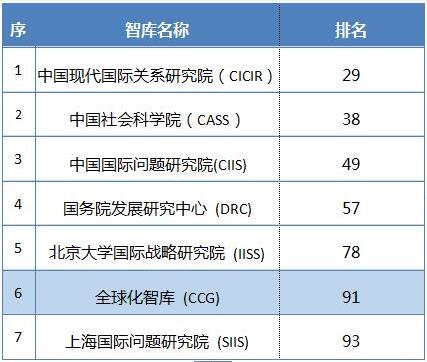中國現(xiàn)代國際關(guān)系研究院、中國社會科學(xué)院等七個中國智庫上榜,其中,CCG上榜2017年全球頂級智庫百強榜單第91位,成為中國首個入選世界百強的社會智庫。Jf7安康新聞網(wǎng)