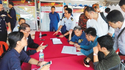 | 3月21日,一艘中國挖沙船在馬來西亞附近海域傾覆。圖為中國駐馬來西亞大使館人員在搜救現(xiàn)場與馬方官員交流。(照片由外交部領(lǐng)保中心提供) |