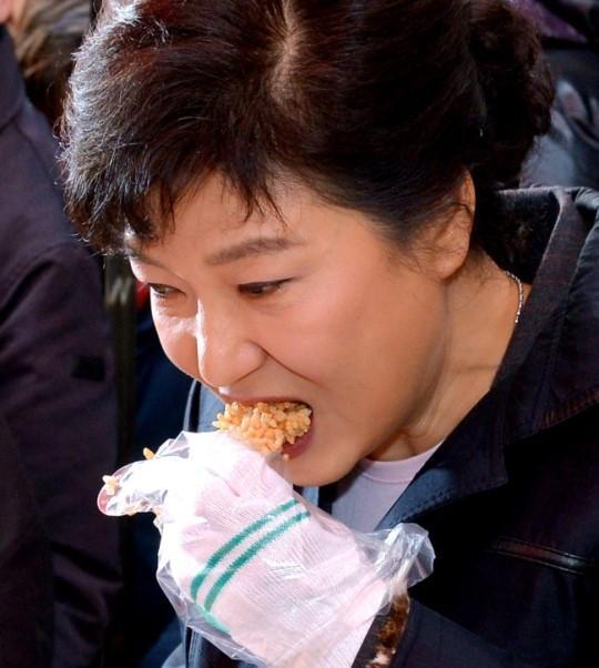2012年11月,總統(tǒng)候選人樸槿惠現(xiàn)身傳統(tǒng)市場,購買糕點(diǎn)并品嘗。