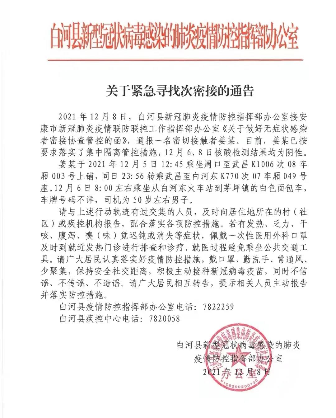 2021年12月8日,白河縣新冠肺炎疫情防控指揮部辦公室接安康市新冠肺炎疫情聯(lián)防聯(lián)控工作指揮部辦公室《關(guān)于做好無癥狀感染者密接協(xié)查管控的函》,通報一名密切接觸者姜某。目前,姜某已按要求落實了集中隔離管控措施,12月6、8日核酸檢測結(jié)果均為陰性。