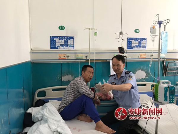 病床前的暖心扶貧。該圖為白河交警大隊民警帶著水果入院看望低保貧困戶,并熱情耐心向其講解健康扶貧政策,鼓勵殘疾單身老人挺過難關堅定生活信心。攝影 楊鳴……