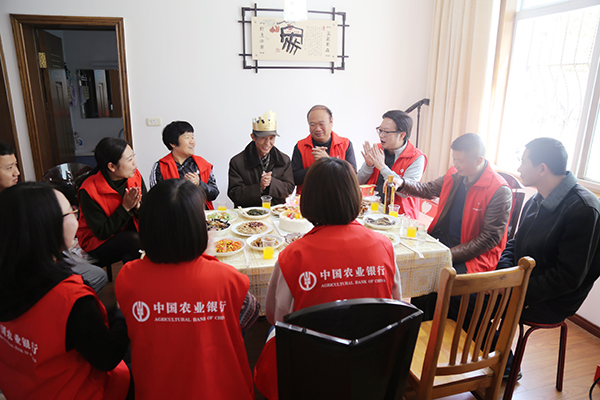 生日當天,漢濱農(nóng)行副行長董曉春代表領(lǐng)導(dǎo)班子攜部分青年員工,帶著對空巢老人的濃濃關(guān)愛和厚重的生日禮物,來到我的住室,陪我度過了一個頗具特殊社會意義的生日。幾位領(lǐng)導(dǎo)同我聊天,向我噓寒問暖。青年人給我洗衣拖地,替我做飯。一時間,住室里如春風(fēng)柔沐,暖日曛曛,彌揚著濃濃的溫暖和愛意,給一個老人心里注入了非比一般的欣慰,驅(qū)盡了獨居生活的寂寞。他們的愛心給我送來一次最為幸福的生命享受。