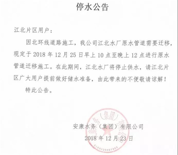 因北環(huán)線道路施工,安康水務(wù)(集團(tuán))有限公司江北水廠原水管道需要遷移,現(xiàn)定于2018年12月25日上午10時(shí)至晚上12時(shí)進(jìn)行原水管道遷移施工。在此期間,江北水廠將停止供水,請(qǐng)江北片區(qū)廣大用戶提前做好儲(chǔ)水準(zhǔn)備,由此帶來的不便敬請(qǐng)諒解!