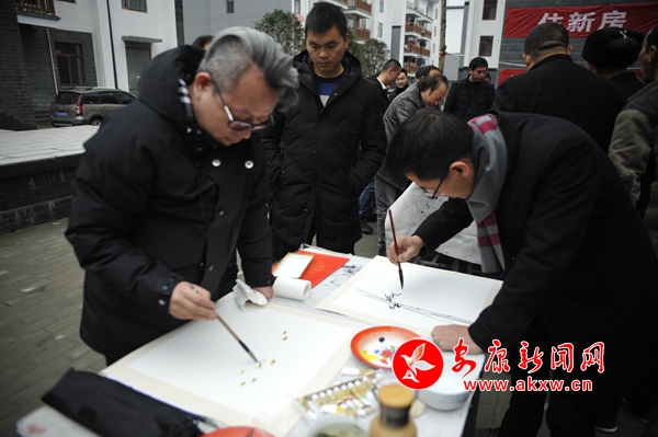 座談結(jié)束后,郭線廬一行在該鎮(zhèn)社區(qū)廣場開展了春聯(lián)義寫活動,F(xiàn)場創(chuàng)作書畫作品免費(fèi)贈予群眾,來自省、市、區(qū)的書畫家們飽含激情,現(xiàn)場揮毫潑墨,把一個個“福”字、一副副對聯(lián)、一張張精心創(chuàng)作的書畫作品送到群眾的手中,受到了周邊群眾的歡迎。