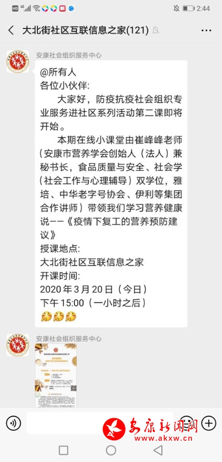 本網(wǎng)訊(通訊員 林超)近日,大北街社區(qū)邀請(qǐng)安康社會(huì)組織服務(wù)中心通過(guò)線上學(xué)習(xí)的新模式,積極開(kāi)展2020年社區(qū)第一季度市民學(xué)校學(xué)習(xí)活動(dòng)。qhD安康新聞網(wǎng)