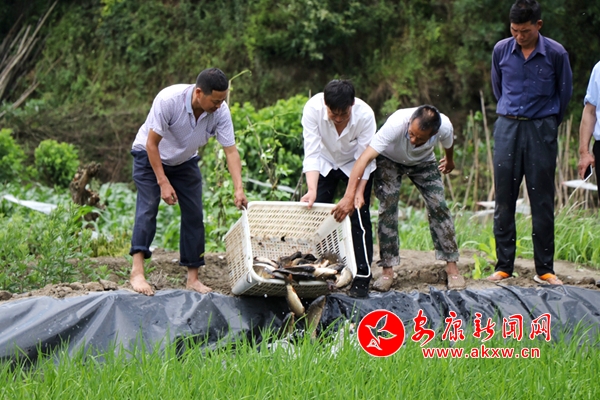 看到鄰村嘗到了甜頭,瓦房村今年也發(fā)展了52畝稻魚,并成立了瓦房村集體股份經濟合作社,吸納18戶貧困戶加入。當天,該村組織村民投放魚苗,并與公司簽訂了稻魚收購協(xié)議,預計第一批稻田生態(tài)魚10月份可以上市。