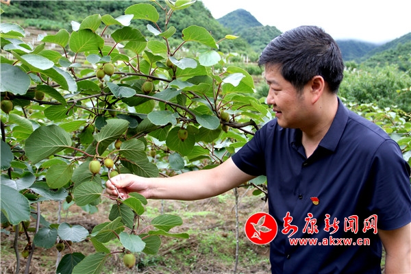 白云飛在查看村里獼猴桃長(zhǎng)勢(shì)情況