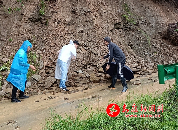 一路上應(yīng)急小隊(duì)仔細(xì)關(guān)注村內(nèi)各處情況,并仔細(xì)叮囑各監(jiān)測(cè)點(diǎn)村戶,時(shí)刻關(guān)注險(xiǎn)情,一定要做好提前撤離的準(zhǔn)備,人身安全是第一位。應(yīng)急小隊(duì)巡查到村內(nèi)山體多處垮塌,阻斷道路,1處道路嚴(yán)重?fù)p毀和1處山體嚴(yán)重垮塌已第一時(shí)間上報(bào)。監(jiān)測(cè)到26組村民王仁聰家的生產(chǎn)用房屋后淤積嚴(yán)重,有垮塌隱患,第一時(shí)間撤離屋內(nèi)2人和7頭牲畜,保障村民人身和財(cái)產(chǎn)安全。