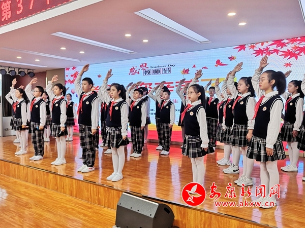 “薄霧朦朧,當(dāng)天空染上第一縷朝霞,您的身影已出現(xiàn)在校園……”來(lái)自果園小學(xué)六年級(jí)二班的少先隊(duì)員激情朗誦《致敬愛(ài)的老師》,深情謳歌教師的無(wú)私大愛(ài),拉開(kāi)了教師節(jié)慶祝大會(huì)的序幕。