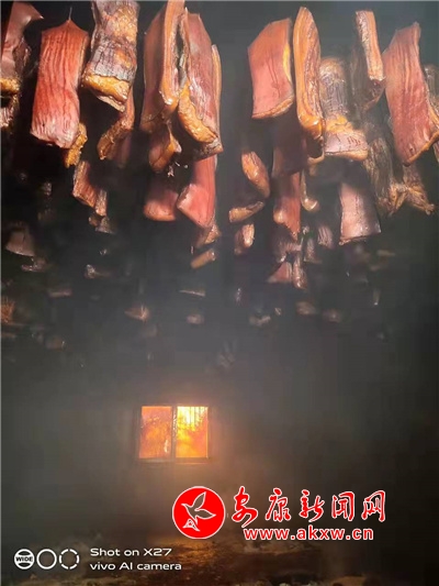 烘房里掛滿了密密麻麻的臘肉。一塊塊臘肉金黃油亮,散發(fā)著沁脾的臘香,幾段青岡木橫在地上,灰白的余燼中閃著火星。