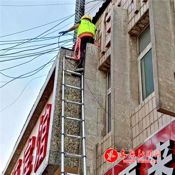 7月11日上午,頂著烈日,現(xiàn)場通訊工作人員正在對中渡路、進(jìn)站路空中搭掛的線纜進(jìn)行梳理整治,采取梳理、捆扎、搭梯、剪線等多種方式,對雜亂無章的線纜進(jìn)行梳理和拆除,進(jìn)一步規(guī)范各類線網(wǎng),消除安全隱患,確?罩芯路布局科學(xué),還城市一個(gè)美麗“天際線”。