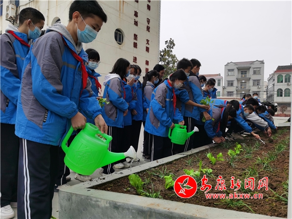 “請幫我拿幾株菜苗!”八年級一班的學(xué)生們在平整好的空地里爭先恐后地移植著生菜,身后三兩個手拿灑水壺的學(xué)生正在為栽好的菜苗澆水。在老師的指導(dǎo)下,學(xué)生們積極參與平整土地、起苗、打坑、栽植、澆水,不一會兒,又一塊橫成行、縱成列的生菜地,出現(xiàn)在該校園一角。