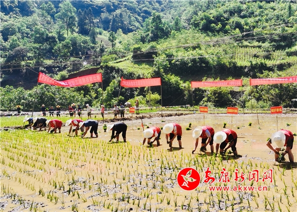 “傳承農(nóng)耕文化 共筑糧食安全。”活動現(xiàn)場,干部群眾熱情高漲,干勁兒十足,協(xié)同進行水稻秧苗移栽,每支隊伍參賽選手在田間橫向排列,埋頭彎腰,按照“淺、直、滿、勻、齊”的標準,一手拿著稻苗,另一手快速從中分秧、插秧,腳步過處,一排排綠油油的秧苗在田間均勻落下。