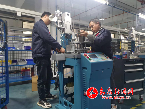 在安瑞智能制造公司試車間,工人們對一臺臺織襪智能一體機(jī)進(jìn)行出廠前調(diào)試。這臺機(jī)器即將交付百潤襪業(yè)有限公司。“織縫翻一體智能織襪機(jī)結(jié)合了織襪,縫頭,翻襪三道工序,通過電腦系統(tǒng)控制一次完成,從而大大縮短了生產(chǎn)周期,減少生產(chǎn)場地,減少工人使用量等優(yōu)點(diǎn),降低了生產(chǎn)成本,增強(qiáng)了市場競爭力,這和傳統(tǒng)襪機(jī)相比襪子織好翻過來送到縫頭車間縫合后再翻過來送到下道工序,具有革命性的突破。”投資公司總經(jīng)理汪海寧介紹道。