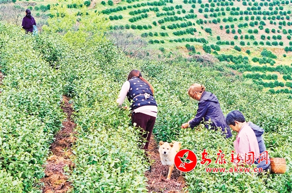 △ 茶農(nóng)在漢濱區(qū)瀛湖鎮(zhèn)火星村茶葉示范園采摘新茶
