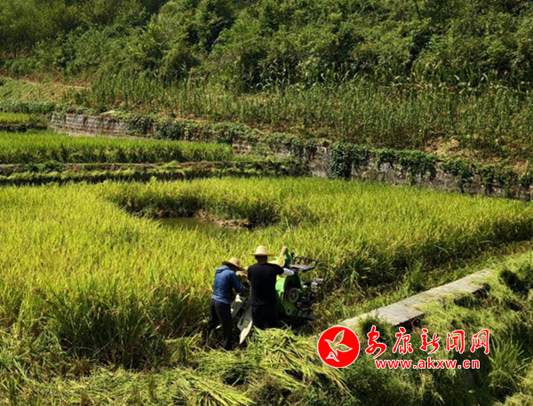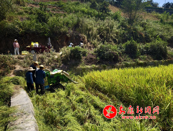 一陣輕風吹過,放眼望去,稻浪翻滾,遍野稻香,村民們收割作業(yè)的身影穿梭其中,與金色的稻田相映成趣,豐收的喜悅奏響了鄉(xiāng)村振興的奮進曲。