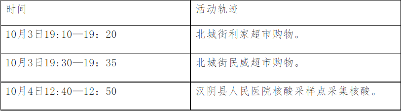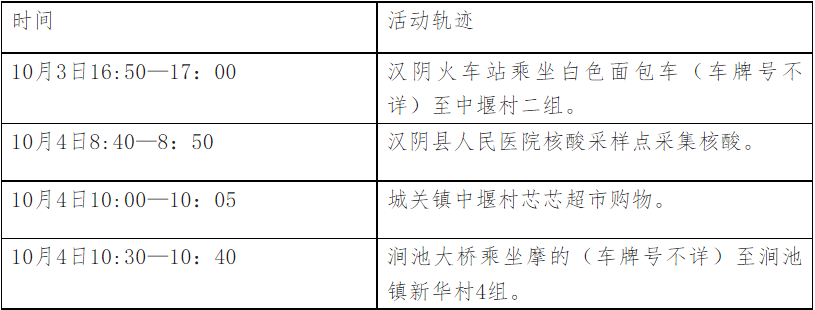根據(jù)流調(diào)情況,現(xiàn)將漢中一例初篩陽性病例涉及密切接觸者在漢陰縣公共場所活動(dòng)軌跡公布如下: