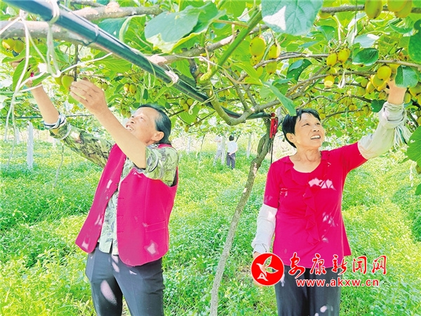走進(jìn)觀音河鎮(zhèn)水田村獼猴桃種植基地,放眼望去,片片綠葉下,一個(gè)個(gè)果型飽滿、大小勻稱的獼猴桃掛滿枝頭。陽光透過片片綠葉,照射在青黃色的果實(shí)上,清新的果香隨風(fēng)四溢。
