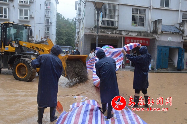 而在馬家院子安置小區(qū),由于水流蔓延太廣,導(dǎo)流入河還需要拐過一個(gè)直角彎道,采用原先的方式排水用時(shí)太慢。搶險(xiǎn)隊(duì)立刻升級方案,調(diào)來兩臺鏟車和三米多寬的塑料布,規(guī)劃好排水方向后。隊(duì)員們并排牽好塑料布,鏟車輪流將泥沙倒在布上再折疊壓實(shí),十幾名搶險(xiǎn)隊(duì)員們齊心協(xié)力,在鏟車配合下,不到兩小時(shí)就將一條近百米長的排水堤壩就搭建完成,積水被順利排出。