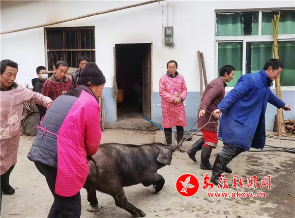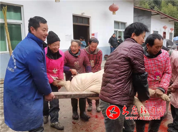 五組村民余美軒當天要宰殺6頭年豬,除了留1頭自己食用外,其余5頭早就被人預定,客戶一早就來到他家等候。余美軒家有4口人,屬一般脫貧戶,兒子有時在外打零工,生豬主要用自己種植的玉米、紅薯、洋芋,加上紅薯藤和一些青草菜葉喂養(yǎng),平時只需要購買了少量飼料。通過一年辛勤喂養(yǎng),每頭豬大約有200斤肉,售價4000余元,靠養(yǎng)豬他們今年就有2萬余元的收入。PxT安康新聞網(wǎng)