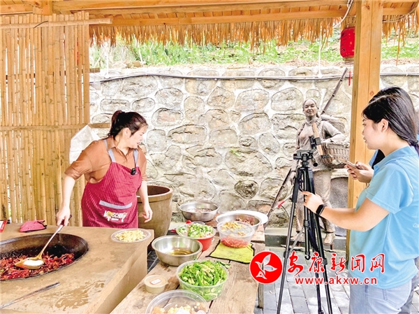 “大家好,我是三翠姐,今天我給大家炒一個嵐皋特色美食——酸辣魔芋豆腐!它酸辣鮮香,嫩滑爽口,富含豐富的膳食纖維……”在嵐皋縣四季鎮(zhèn)楊家院子非遺作坊小院……