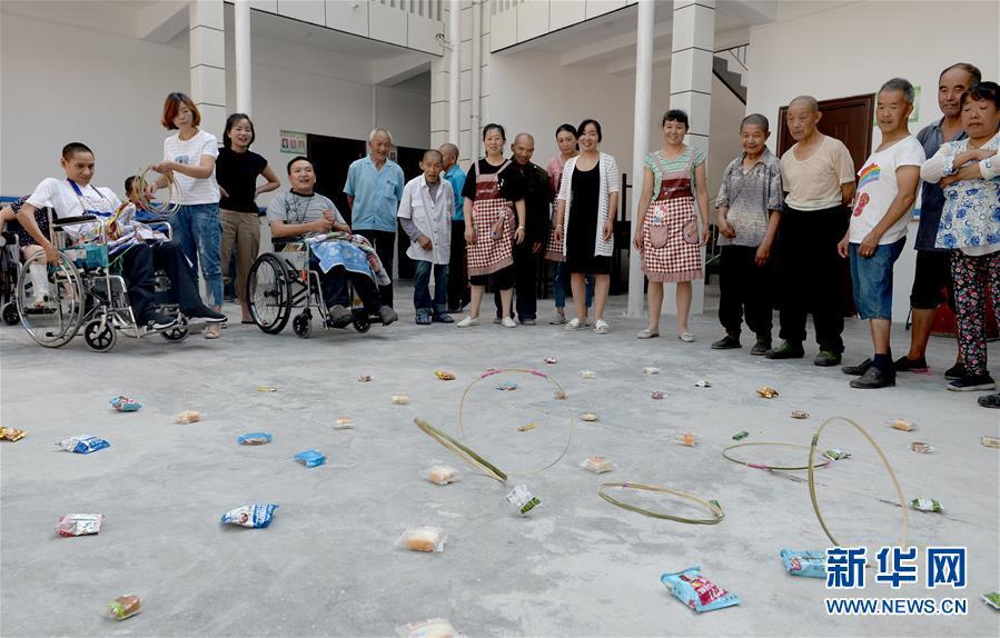 寧陜縣中心敬老院五保失能托養(yǎng)中心內(nèi),托養(yǎng)人員在一起進(jìn)行套圈游戲(8月20日)。 自2016年9月起,陜西寧陜縣開(kāi)始實(shí)行貧困失能、半失能人員集中供養(yǎng),為其提供干凈舒適的住所、24小時(shí)全面護(hù)理,不僅讓貧困失能、半失能人員得到良好照料,也徹底將失能家庭解放出來(lái),全身心脫貧致富奔小康。目前,寧陜登記在冊(cè)貧困失能、半失能人員共有467人,其中320人已分別在全縣4個(gè)敬老院的五保失能托養(yǎng)中心內(nèi)進(jìn)行集中供養(yǎng),剩余人員將于托養(yǎng)中心床位逐步完善后全部入住。 新華社記者 劉瀟 攝