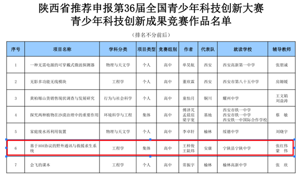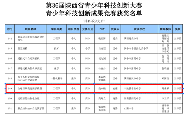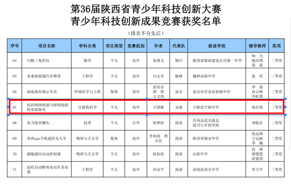 據(jù)悉,陜西省第36屆青少年科技創(chuàng)新大賽由省科協(xié)、團(tuán)省委、省婦聯(lián)共同主辦。大賽分青少年科技創(chuàng)新成果競(jìng)賽、科技輔導(dǎo)員創(chuàng)新成果競(jìng)賽、青少年科技實(shí)踐活動(dòng)、青少年科技創(chuàng)意比賽、少年兒童科學(xué)幻想繪畫(huà)比賽等五個(gè)類別。全省高中組青少年科技創(chuàng)新成果競(jìng)賽共評(píng)出108個(gè)獎(jiǎng)項(xiàng),其中一等獎(jiǎng)9項(xiàng),被推薦參加全國(guó)大賽僅7項(xiàng)。我校兩名學(xué)生的科技創(chuàng)新項(xiàng)目榮獲一等獎(jiǎng),并拿到參加全國(guó)大賽通行證實(shí)屬不易,彰顯了學(xué)校科技創(chuàng)新特色發(fā)展的強(qiáng)大實(shí)力。