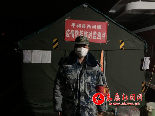 西壩村現(xiàn)役軍人陳玉沈在大疫面前,立書請戰(zhàn),成為了一名疫情防控志愿者,被分派到平利西河鎮(zhèn)段家河監(jiān)測勸返點,負(fù)責(zé)值班值守,監(jiān)測勸返。