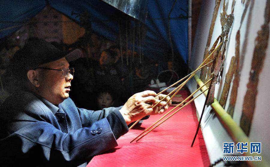 3月15日,平利縣國(guó)家非遺文化傳承人吳承權(quán)在縣城中心廣場(chǎng)為群眾表演弦子腔。新華社記者 陶明 攝