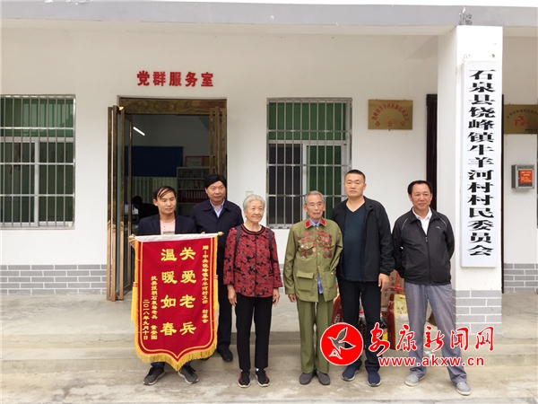 安康新聞網(wǎng)訊(通訊員 楊曉莉 王全軍 )“感謝牛羊河村委會,感謝你們駐村工作隊。”身著退伍軍裝,勛章掛滿胸前的抗美援朝老兵董安國握著石泉縣饒峰鎮(zhèn)牛羊河村駐村工作隊隊長王全軍的手連連道謝。大家還在納悶中,繡著“關(guān)愛老兵,溫暖如春”的錦旗由董安國夫人、牛羊河村村籍的王武英遞到了村支書張榮全手中。