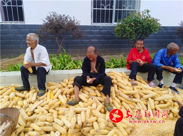 一大早,敬老院的費(fèi)院長(zhǎng)就安排院內(nèi)2位職工到玉米地組織工人采收玉米。為了安全起見,院內(nèi)有勞動(dòng)能力的老人沒有安排外出采收,而是負(fù)責(zé)在敬老院內(nèi)組織人員剝玉米、晾曬。工人吆喝著騾子隊(duì)拖著一筐筐玉米回到敬老院,李建國(guó)等幾個(gè)有勞動(dòng)能力的五保老人就過來搭手,將一筐筐玉米攤放在院場(chǎng)內(nèi)晾曬。工作人員和其他的五保老人一起,紛紛參與到剝玉米的行列,院場(chǎng)中堆滿了金燦燦的玉米,老人們個(gè)個(gè)拿著玉米棒子正在脫粒。今年的玉米大豐收,個(gè)個(gè)玉米棒子顆粒飽滿,顏色金黃誘人。大家忙活著,露出豐收的喜悅。