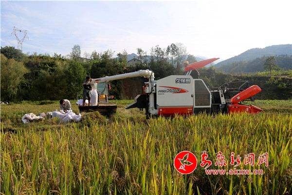 待糧艙裝滿,鄭書鵬按動(dòng)電鈕,合作社的工人迅速拿著編織袋對(duì)準(zhǔn)出糧口,金黃的稻子從艙內(nèi)傾斜而出,“嘩啦啦”翻滾進(jìn)口袋,不一會(huì)兒袋子便鼓了起來(lái),看著飽滿的谷粒,鄭書鵬忍不住捏起幾粒搓了皮塞到嘴里咀嚼起來(lái)。“今年合作社買了一臺(tái)收割機(jī),小半天不到幾塊不成型的小田已經(jīng)全部收割完。以前靠人工收割,全村出動(dòng)要忙活一個(gè)周才能收完,現(xiàn)在有了收割機(jī),還能為周邊市縣的種植戶提供服務(wù)。”良田村合作社負(fù)責(zé)人鄭書鵬喜滋滋地說(shuō)。